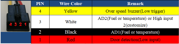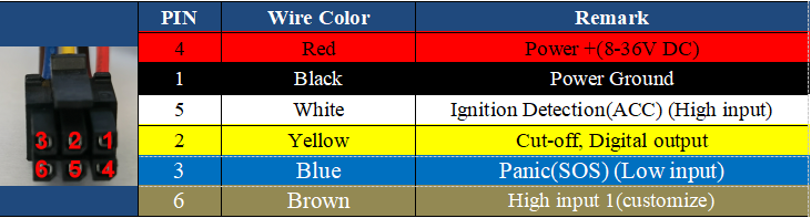 1: ACC detect(High input) 2: SOS detect(Low input) 3: Door detect(Low input) 4: Customize high input 5: Customize low input |